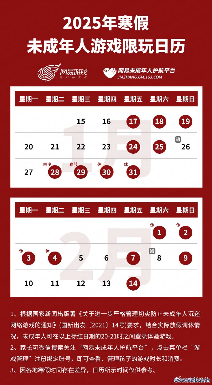 1月9日,网易游戏、腾讯游戏陆续发布2025年寒假未成年人游戏限玩日历表,在线配资炒股未成年玩家在以下标红日期的20-21时可以登录体验游戏。其中,配资世界网_专业配资配_资平台网站网易游戏平台计算寒假时间为1月15日-2月14日,可游戏时长最多16个小时,腾讯游戏计算寒假时间为1月13日-2月13日,可游戏时长最多为15个小时。